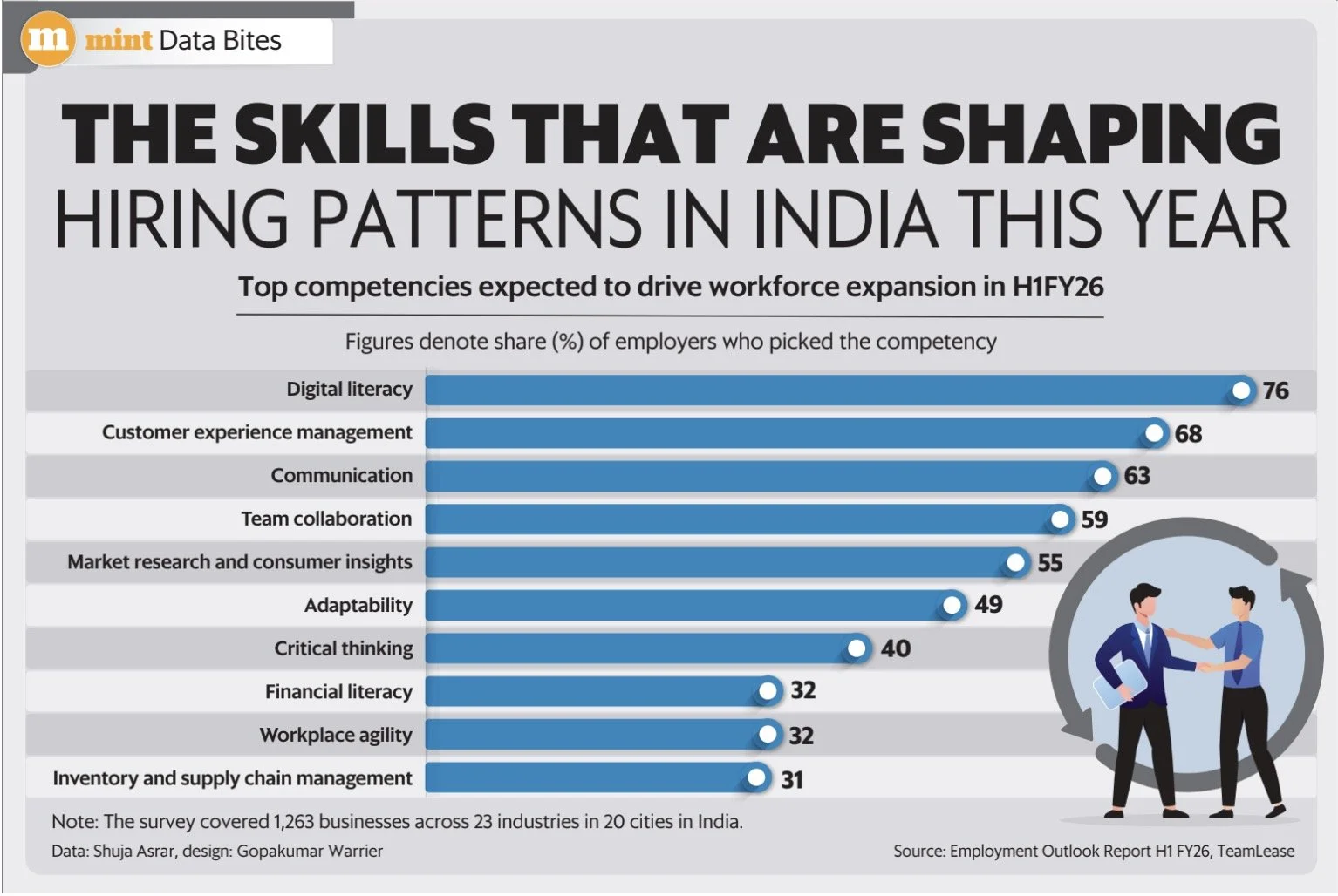 According to the Employment Outlook Report (H1 FY26) by TeamLease, based on a survey of 1,263 businesses across 23 industries and 20 cities in India, employers aren’t just hiring for experience, they’re hiring for skills.