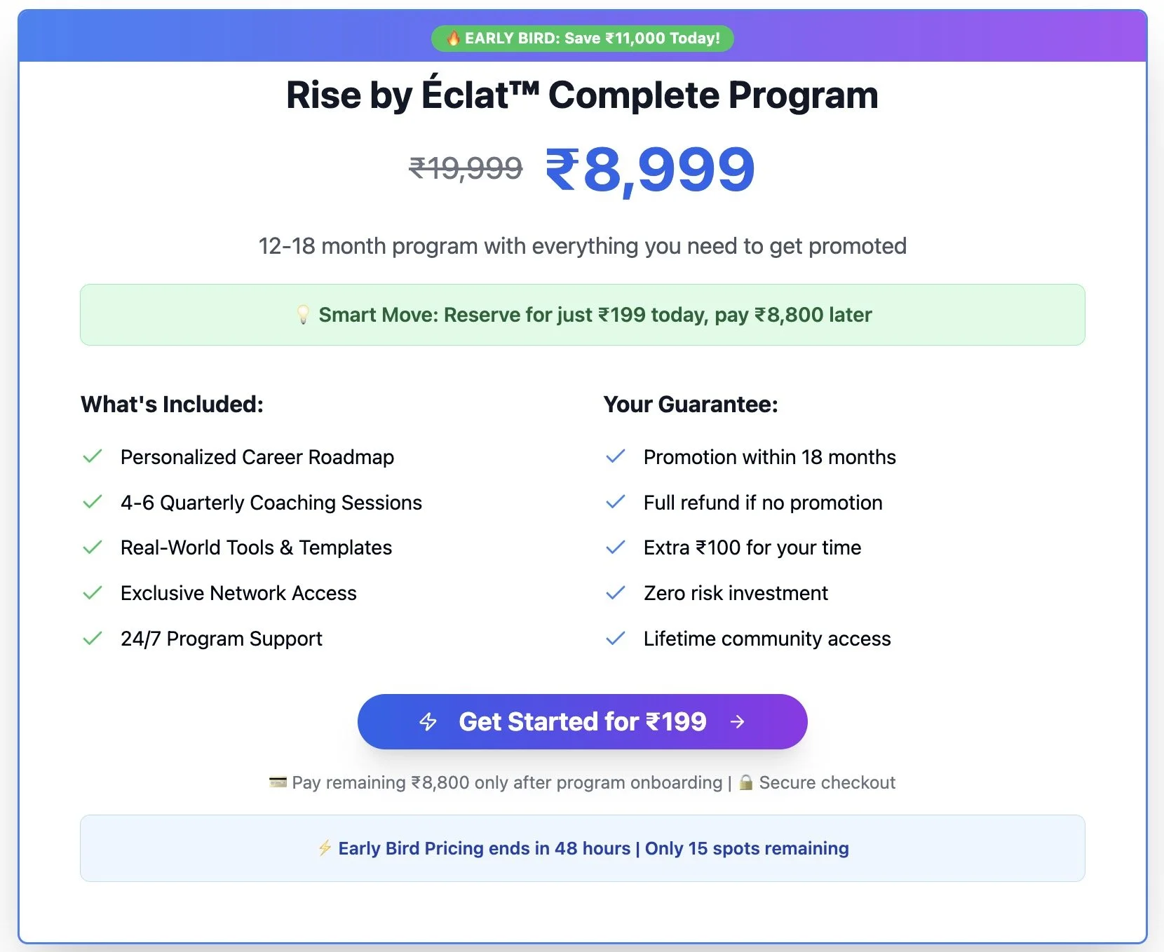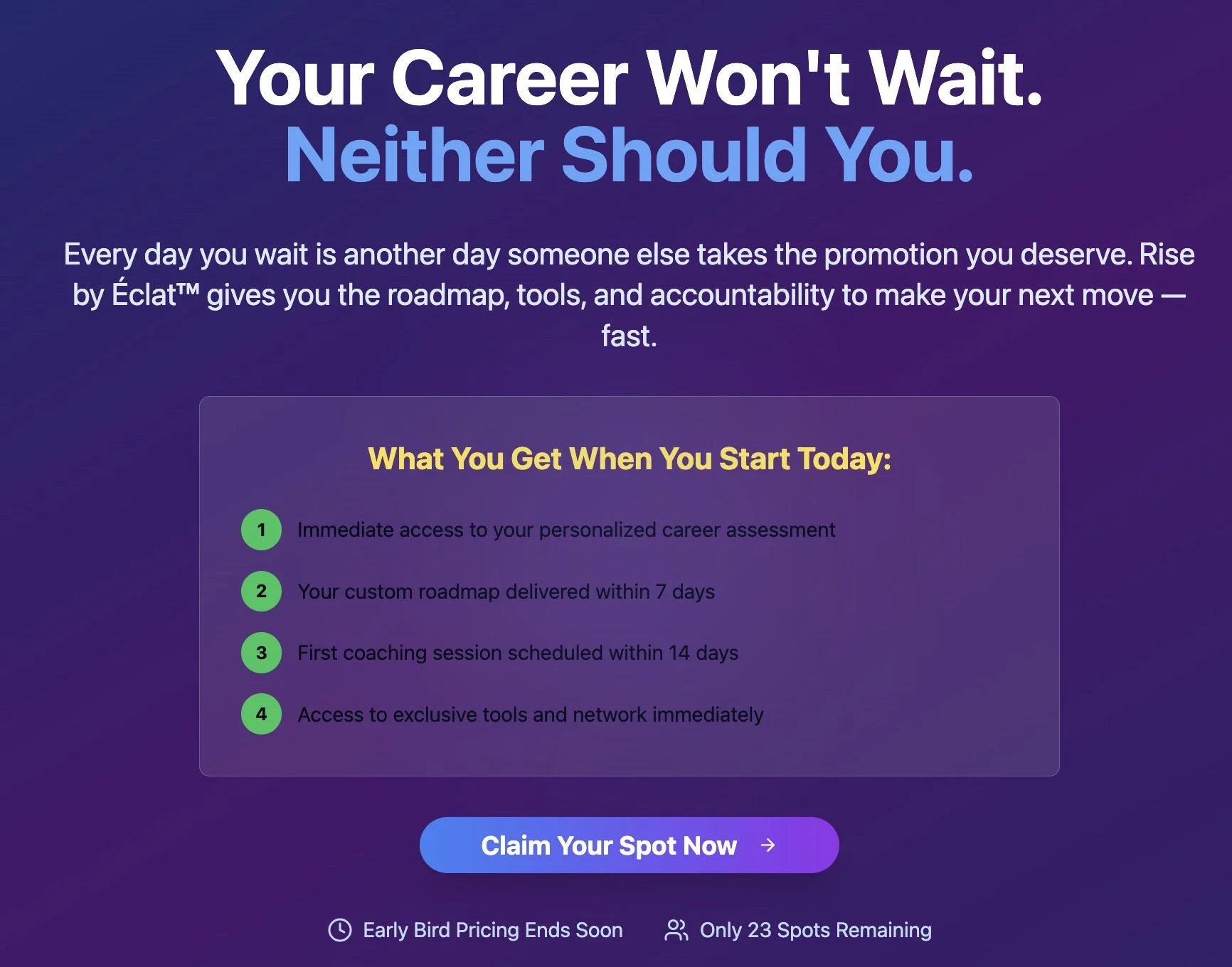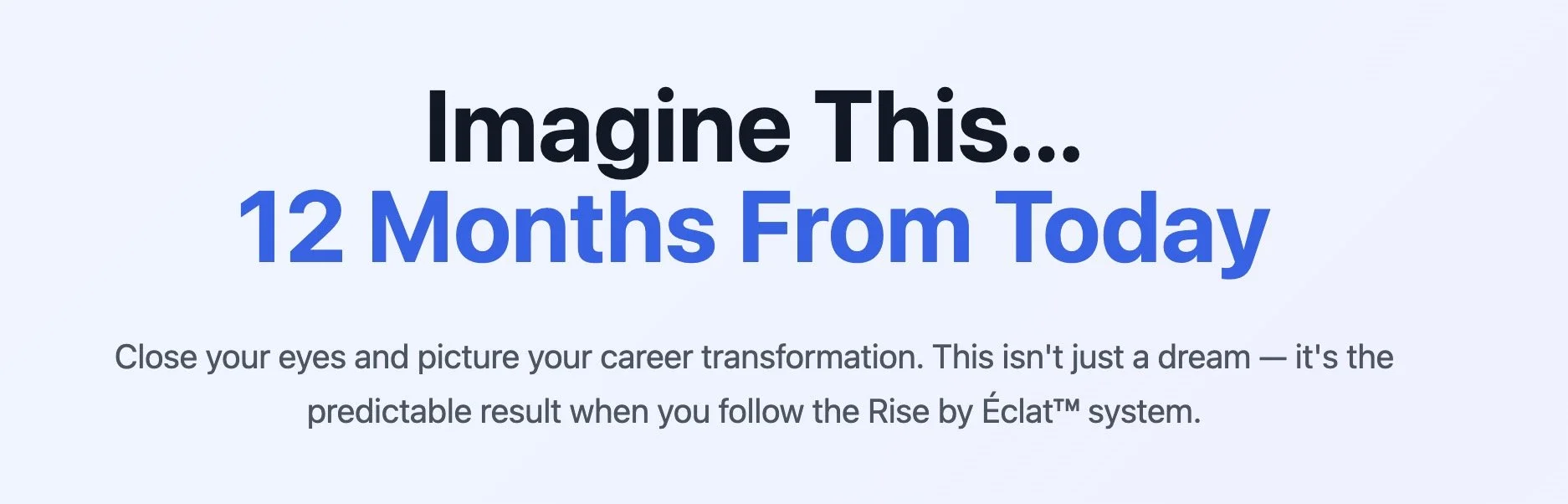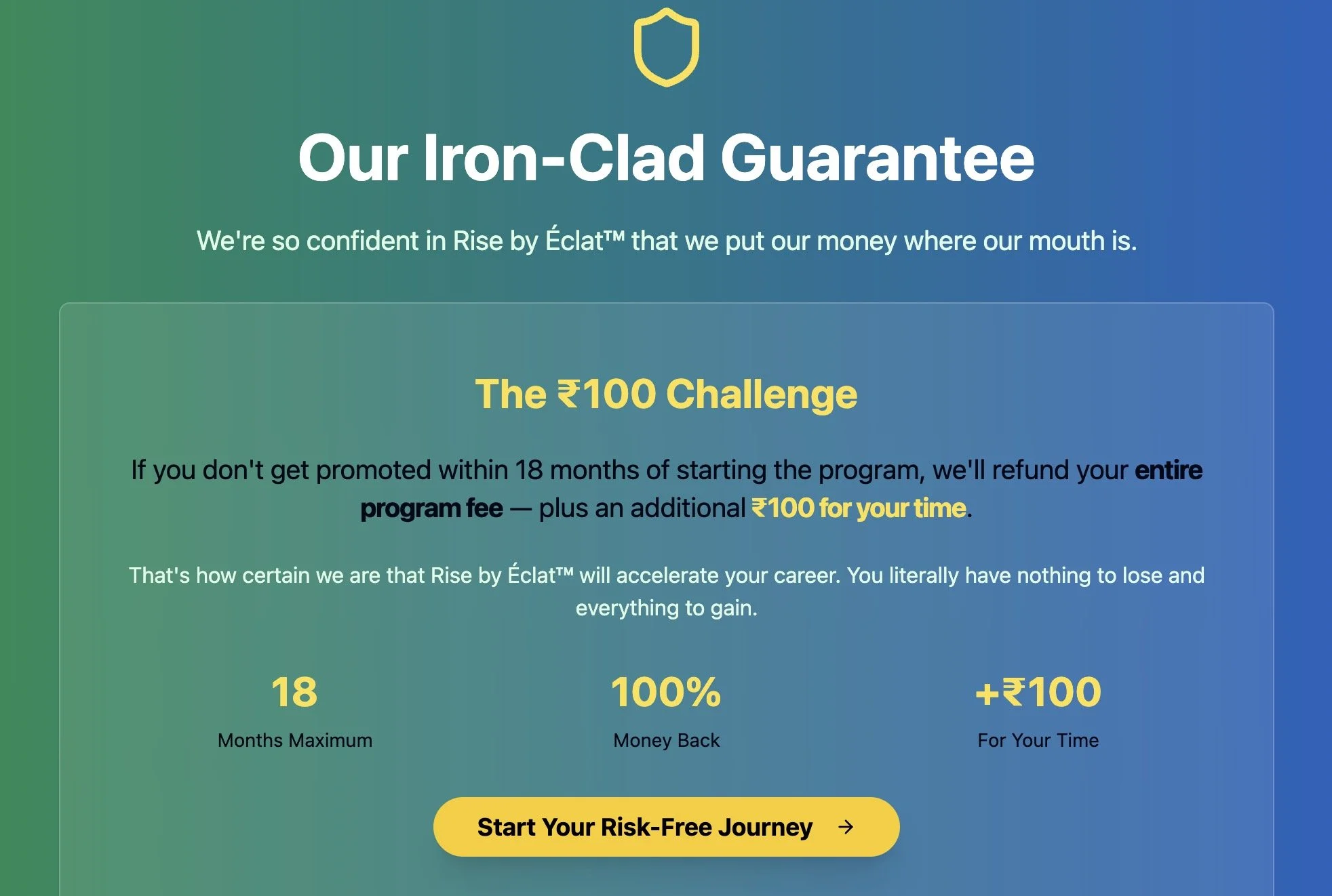 Most career courses give you generic advice. Rise by Éclat™ creates a personalized roadmap based on your specific role, experience, and goals. Plus, we guarantee results with our money-back promise — something no other program offers.