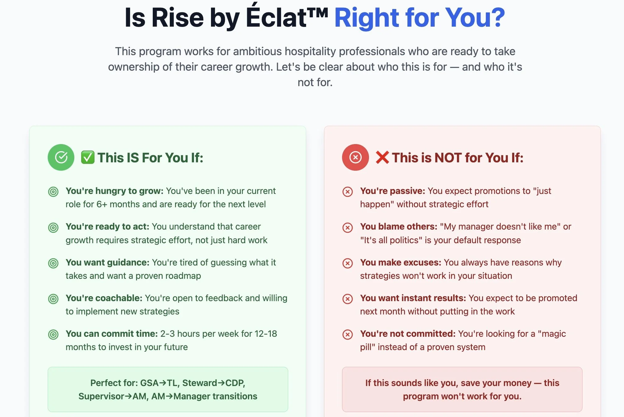 Rise by Éclat™ works for all hospitality professionals — from front desk to F&B, operations to housekeeping, sales to management. Our personalized approach adapts to your specific department and career path.